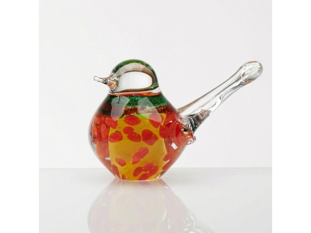 Ptáček malý žlutý s červenými fleky a zelenou hlavou